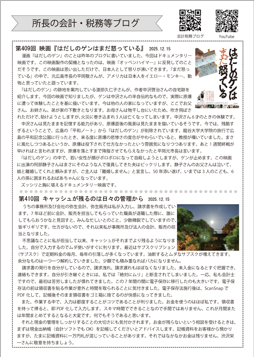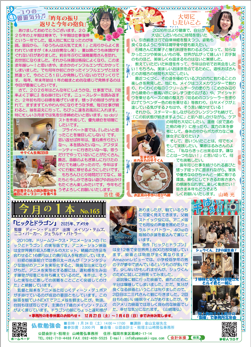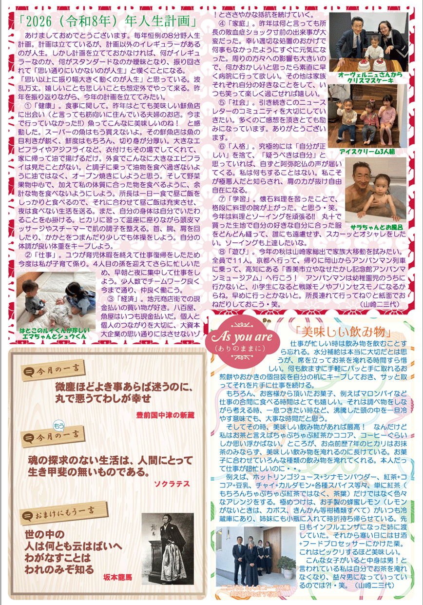 さて、2026(令和8)年新春号は12月に生まれたホヤホヤのサクくんの話題から始まります。また、全員令和7年の振り返りと新年の抱負を語っています。1年あっという間に過ぎましたが、振り返ると色々なことがありました。あんなことやこんなこと。すっかり忘れていたこともあります。やっぱり一日一日を大切に過ごしていきたいと思う年末です。